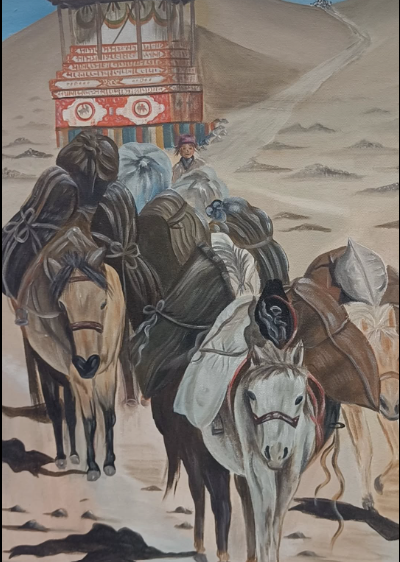 Dorjee Gurung Lama, founder of Dokar Art Studio and Tsering Phonjo Gurung, founder of Chhoser Arts, present works that document the cultural landscapes of Mugu and Mustang respectively, depicting highland settlements, trading routes, pastoral life, and the intimate relationship between people and their environment. Dorjee's paintings, informed by over 28 years of practice and his literary work documenting Karmarong culture, capture the daily rhythms of communities still largely untouched by modern infrastructure, where yaks and goats remain central to survival, and trade continues along ancient routes. Tsering, recognized as Nepal Ambassador of Vision Art Media New York, brings contemporary sensibility to traditional subjects, revealing Mustang's distinctive visual culture.