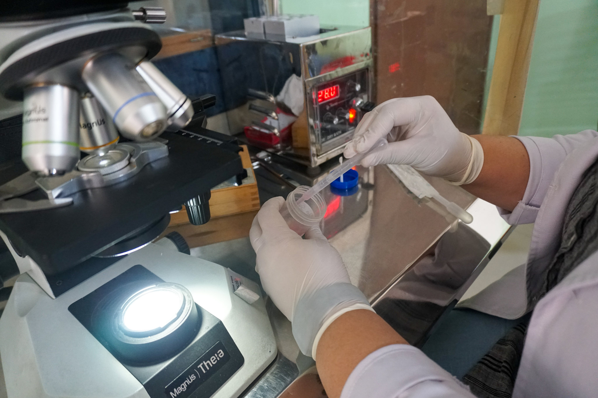 डाक्टर बिनिता थापा काठमाडौंको परोपकार प्रसूति तथा महिला अस्पतालमा माइक्रोस्कोपमा वीर्यको नमूना जाँच गरिहेकी छन् ।